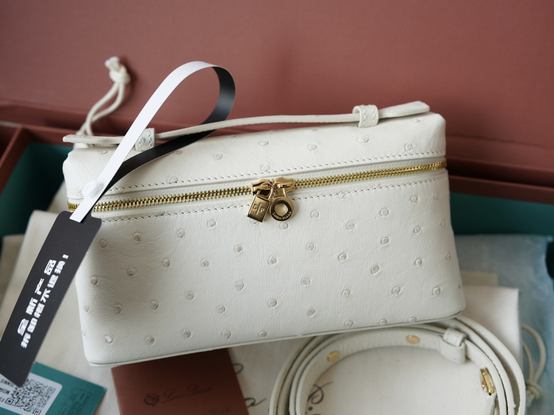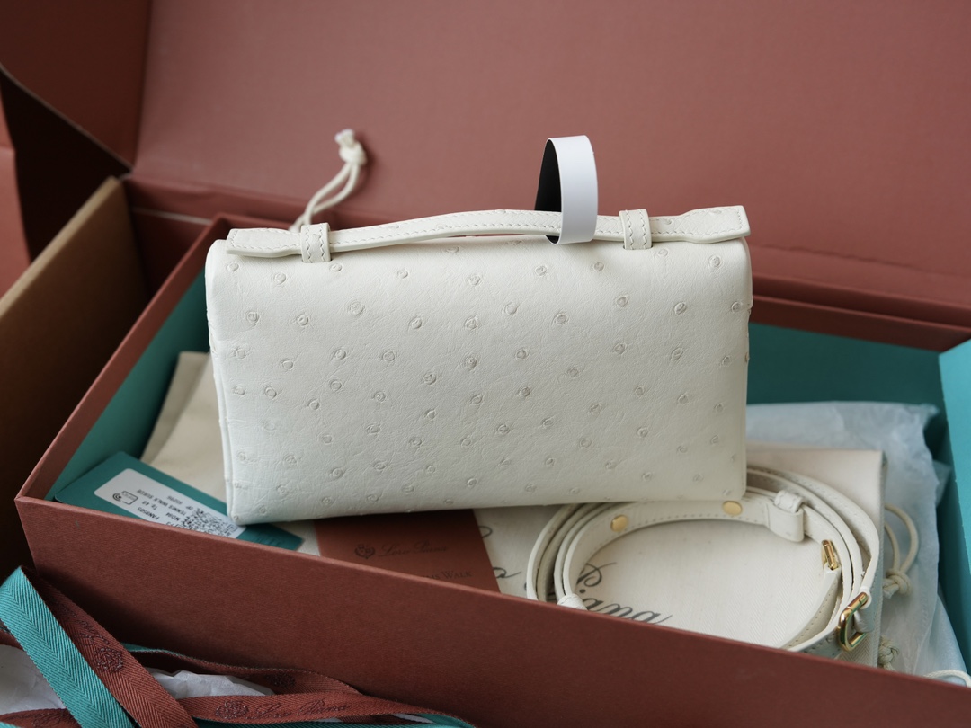 Extra Pocket L19 手拿包是一款精致的杰作,采用真皮鸵鸟皮制成,以其奢华的质感和持久的品质而闻名。这款手拿包采用宁静的低语白色色调,点缀着光芒四射的太阳金细节,体现了低调的魅力,使其成为白天和晚上精致的完美选择。