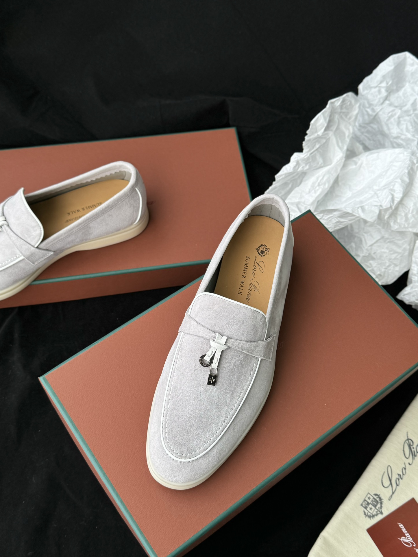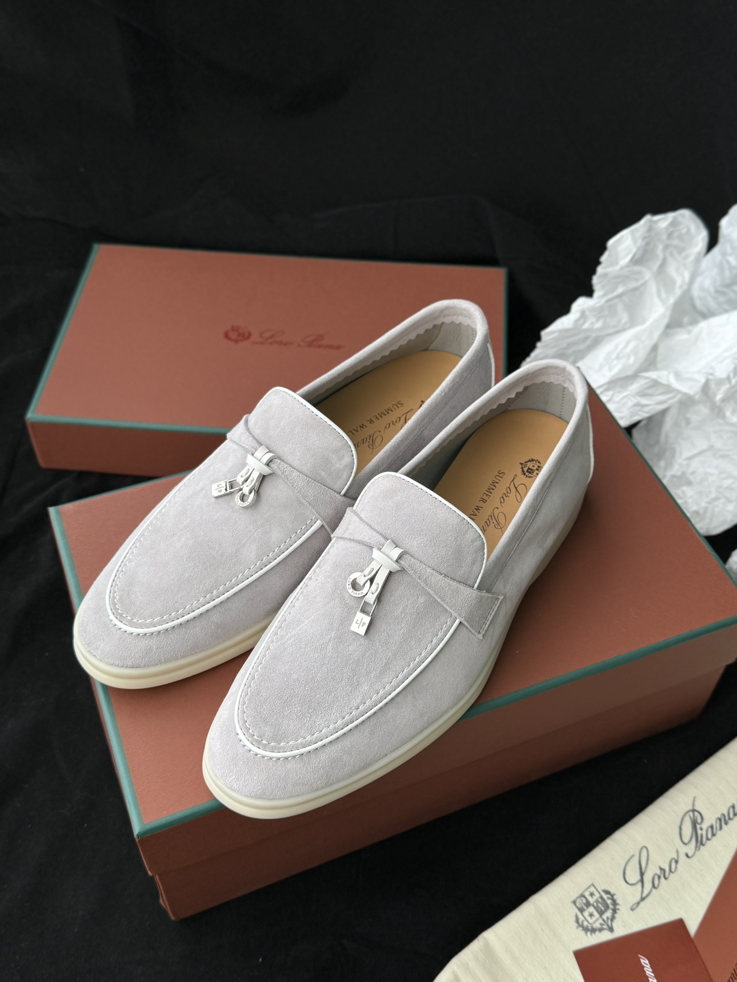这些别致的软皮鞋采用优质绒面革牛皮制成,配有柔软的小羊皮衬里,专为全天舒适和轻松的夏日优雅而设计。现代银灰色调增添了一丝低调的奢华和多功能性,非常适合任何休闲装束。它们轻巧灵活,是您时尚漫步、旅行或休闲聚会的首选搭配。